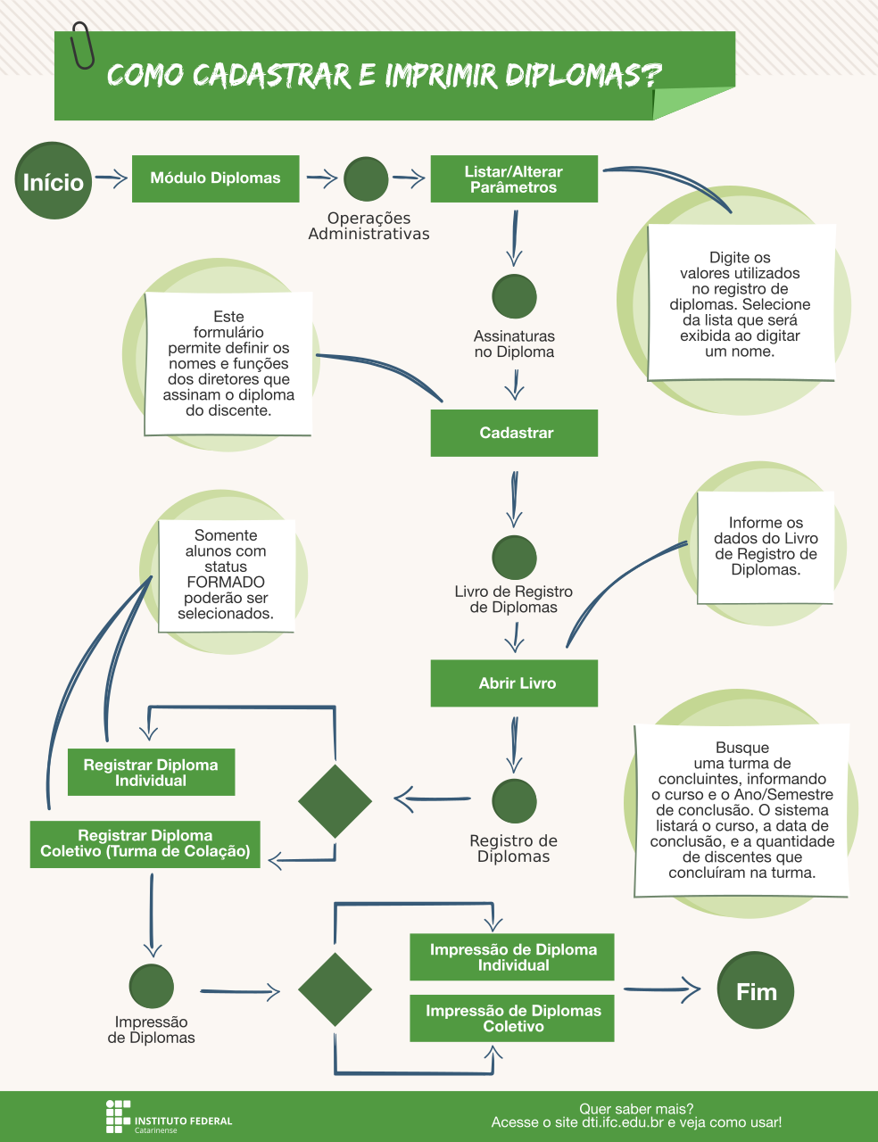 O módulo de diplomas permite gerenciar o processo de emissão de diplomas para os diversos níveis de ensino. Neste módulo é possível cadastrar o livro de registro de diplomas, emitir diplomas de forma coletiva e individual, segunda via entre outras funcionalidades.