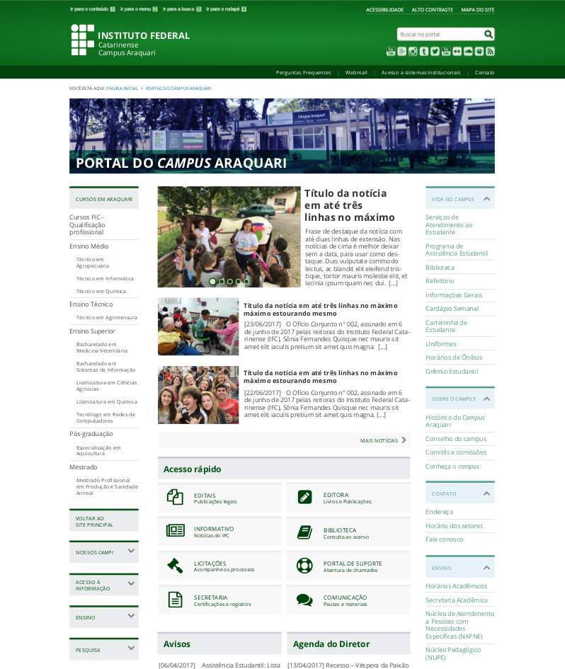 Mostrar código fonteRevisões anterioresLinks reversosExportar para PDFExportar para ODTVoltar ao topo Share via Share via... Twitter LinkedIn Facebook Pinterest Telegram WhatsApp Yammer Reddit TeamsAlterações recentesSend via e-MailPrintPermalink × Nesta seção você encontra os manuais para a gerência do Portal de um Campus NotíciasNotícias são elementos do tipo Post Type Cadastrar Notícia Editar Notícia Inserir Mídias (imagens) Avisos, Eventos e Agenda do GestorSão elementos do tipo Post Type Cadastrar Aviso, Evento ou Agenda do Gestor Editar Aviso, Evento ou Agenda do Gestor Páginas Cadastrar Página Editar Página Menus Gerenciar Menus Gerência do Portal Cadastrar novo site de setor Cadastrar novo site de curso Opções gerais: Alterar gênero do dirigente & Aterar Banner da Página Inicial wiki/websites/portal_campus.txt Última modificação: 2019/06/06 11:37por plinio.garcia