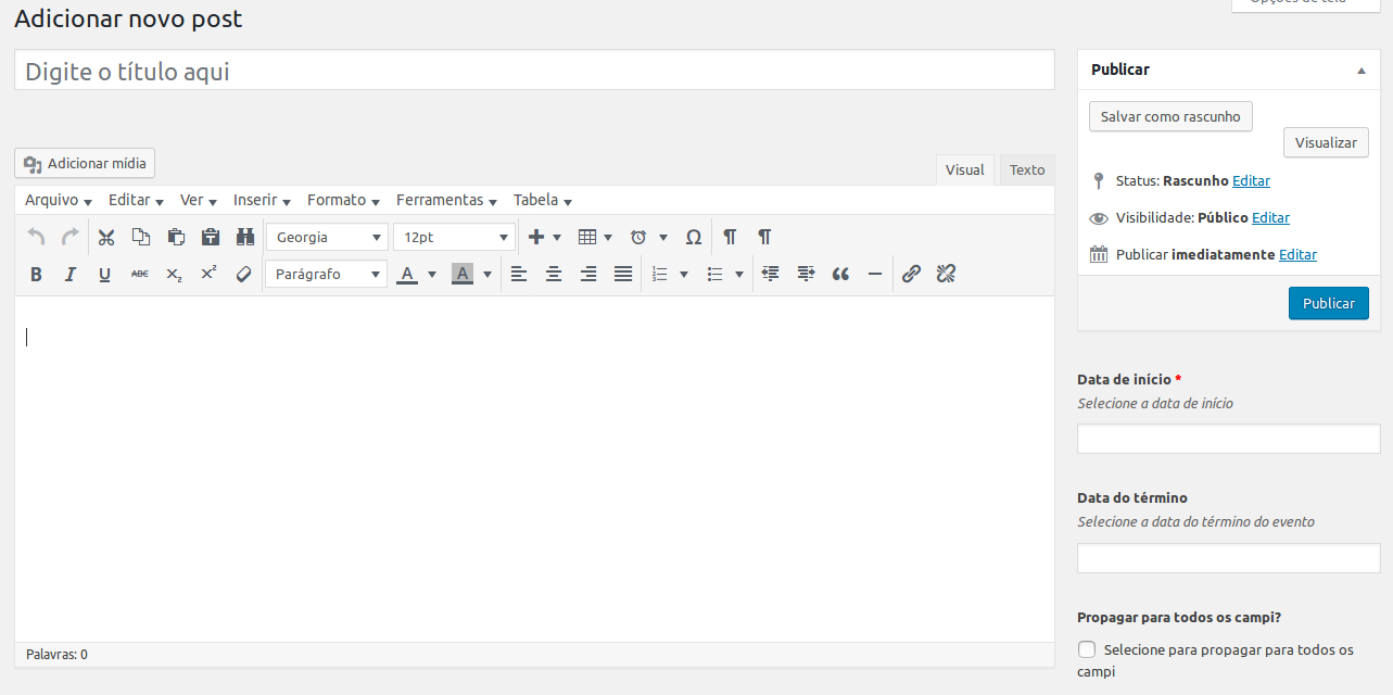 Para que um evento seja criado, é necessário que seja definida uma data de início. Isto também deve ser feito para um compromisso de reitor/diretor.