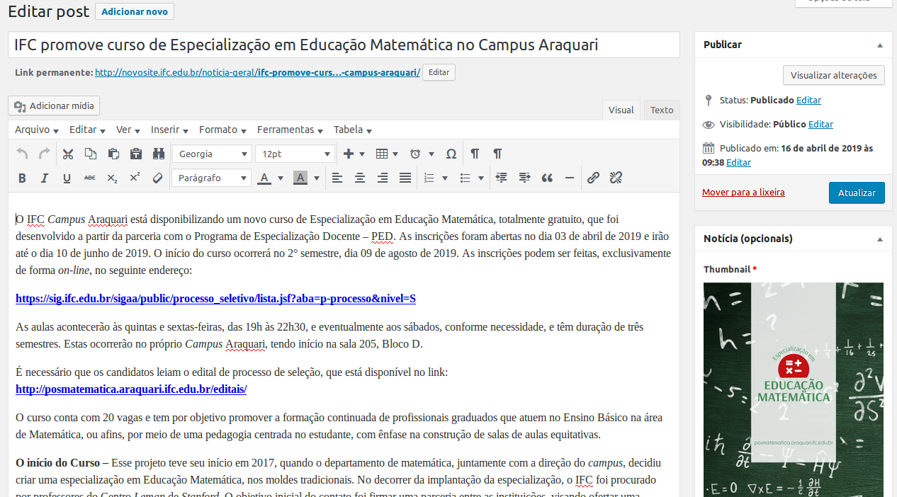 Faça as alterações desejadas e clique botão “atualizar” para publicar a notícia .
