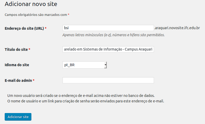 Na tela seguinte informe o endereço, título, idioma e e-mail do administrador do novo site.