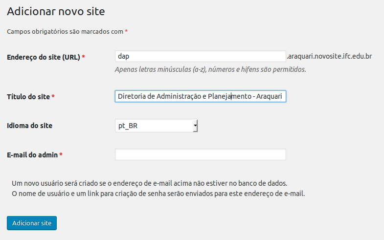 Na tela seguinte informe o endereço, título, idioma e e-mail do administrador do novo site.