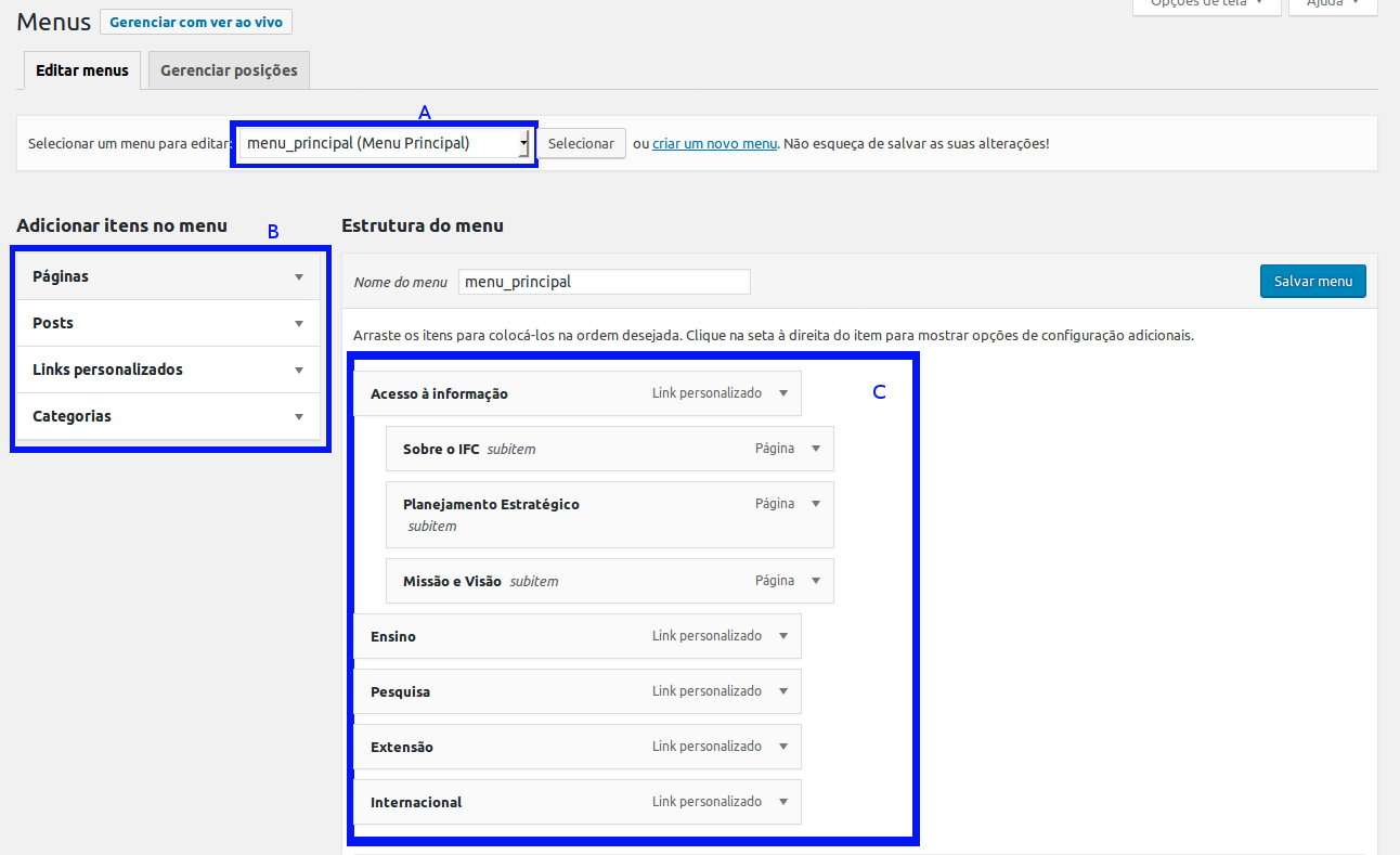 B - Escolha entre Páginas, Posts, Links ou Categorias para inserir no Menu;
